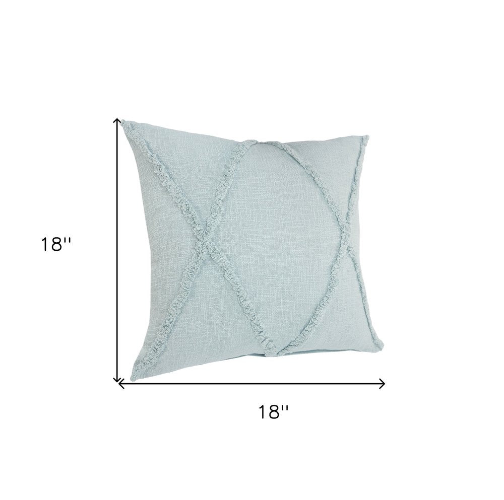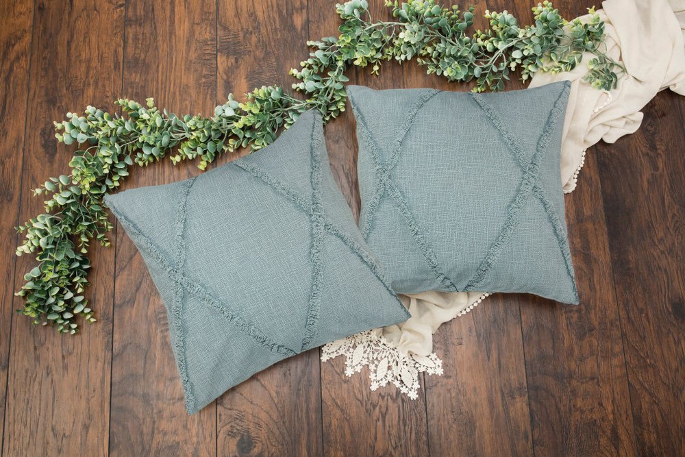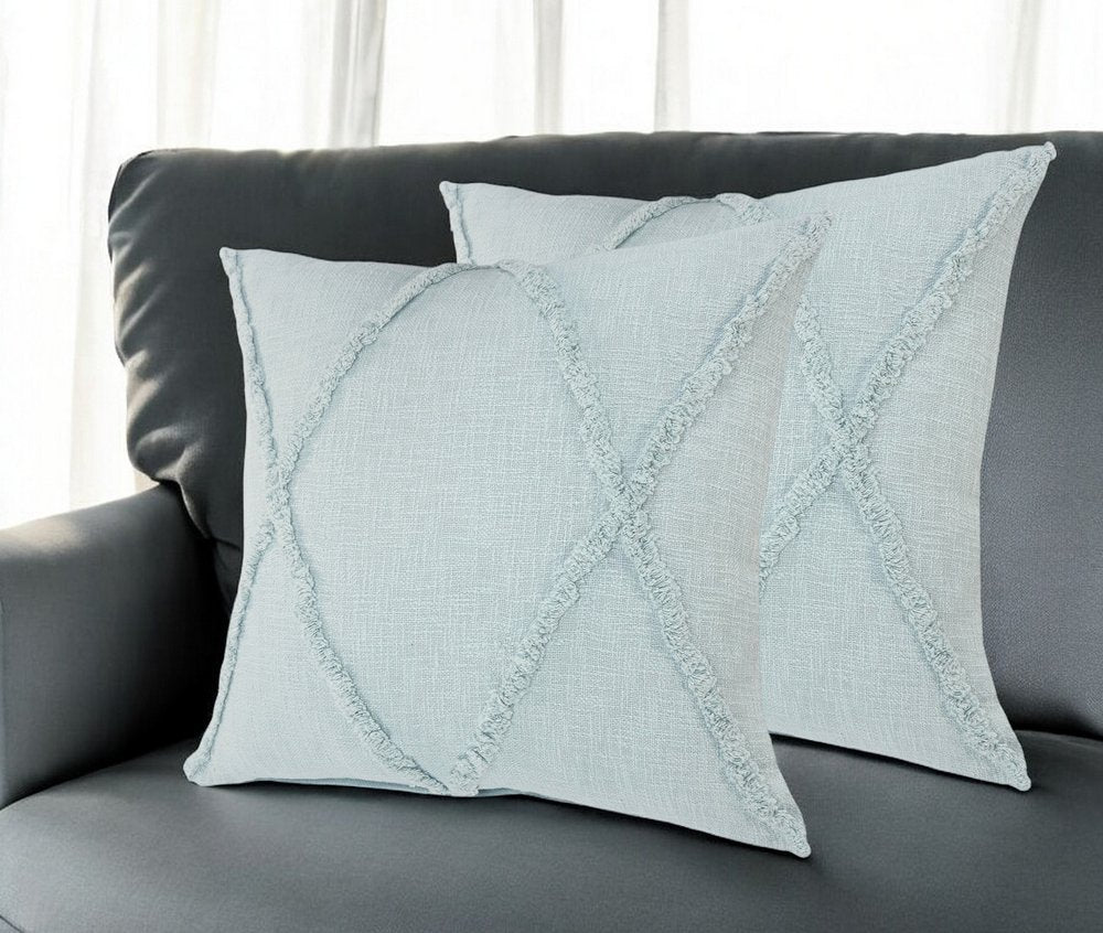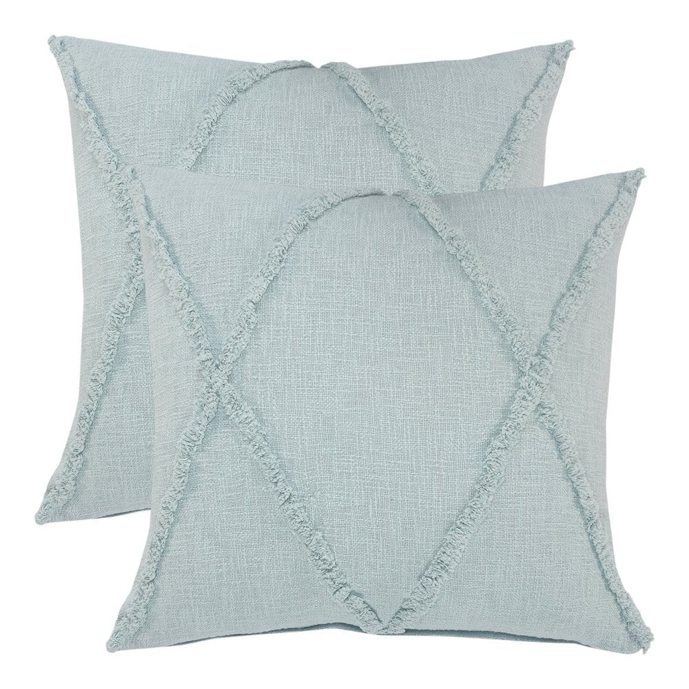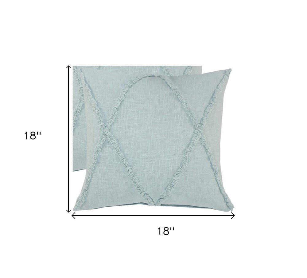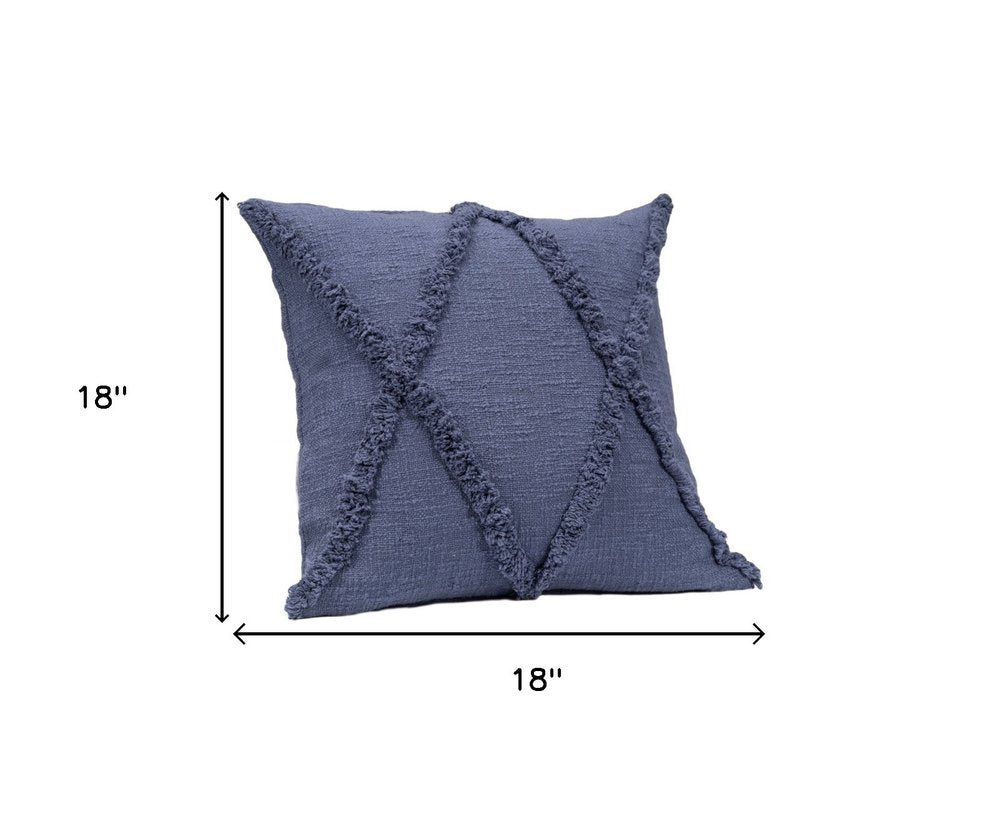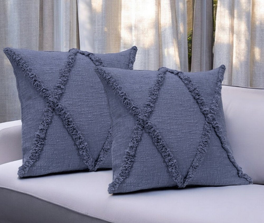Bring a bit of fashion and zip to your space with this eye-catching and comfy set of two blue geometric cotton throw pillow with fringe. Ultra durable blue denim colored cotton has been used to make this decorative pillow set a beautiful look that will stand the test of time. For anyone that loves to decorate or accent their space with color and texture. Decorative pillows are a great way to change up the look and feel of your space easily and quickly. 18-inch H x 18-inch W x 4-inch D