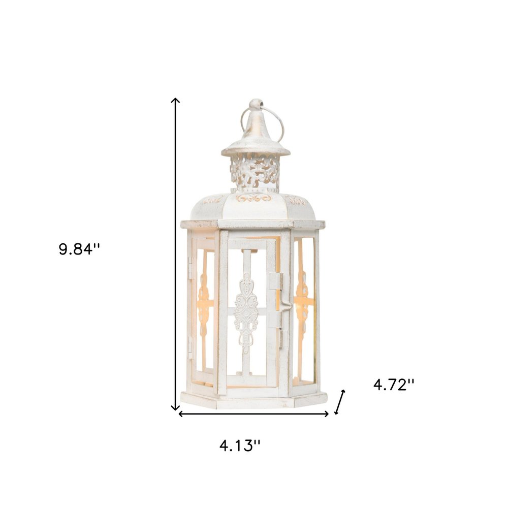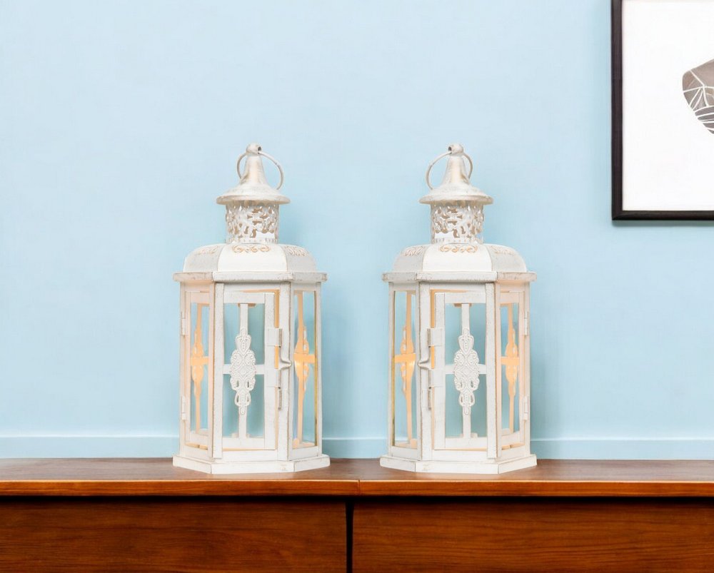 This set of two white and gold glass and metal filigree tabletop lantern candle holders adds flair, function, and visual interest to any home or special occasion. Hand finished by skilled craftsmen and designed to add a glamorous glow to any event or table setting. This candleholder is the perfect illuminating design to accent your space in style. Candleholders are a decorative accent on their own. 9.84-inch h x 4.13-inch w x 4.72-inch d.